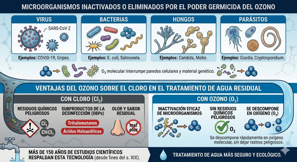 El poder germicida del ozono, reconocido desde la segunda mitad del siglo XIX, ha sido aprovechado desde entonces, por ejemplo, para el tratamiento del agua residual (6), en donde es capaz de inactivar o eliminar a un elevadísimo porcentaje de los microorganismos presentes (7-8), con la ventaja de no dejar residuos químicos peligrosos (9), como ocurre, por ejemplo, con la utilización de cloro y otros germicidas