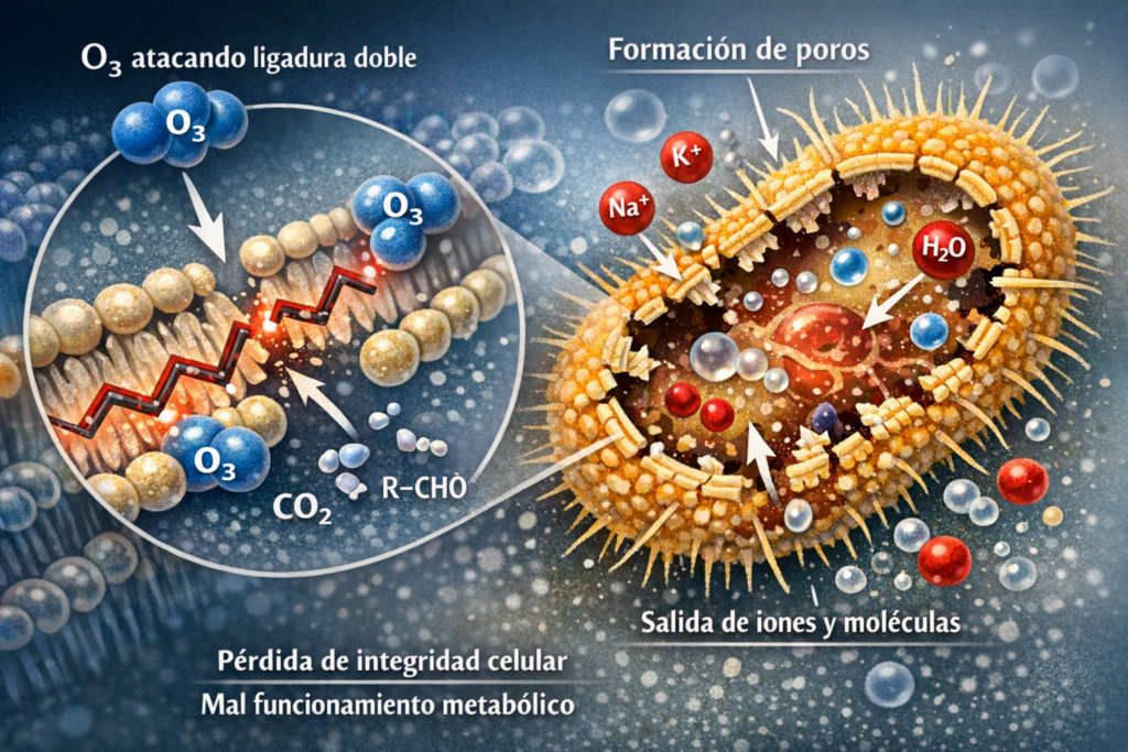 Esto es particularmente cierto en el caso de las moléculas orgánicas. Con los ácidos grasos, por ejemplo, que forman la matriz de las membranas celulares de los microorganismos, el ozono reacciona fácilmente con sus dobles ligaduras y
