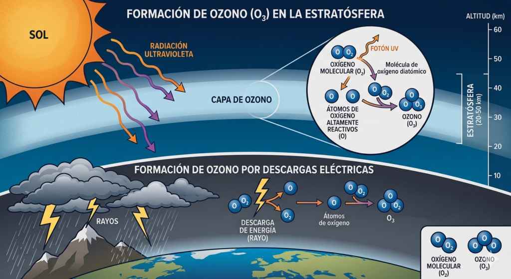Se forma de manera natural en la estratósfera, a una altitud de entre 20 y 50 km sobre el nivel del mar, cuando la radiación ultravioleta proveniente del Sol rompe moléculas de oxígeno diatómico cuyos átomos resultantes, altamente reactivos, se unen a otras moléculas de oxígeno diatómico para completar los tres oxígenos del ozono (1-2.).